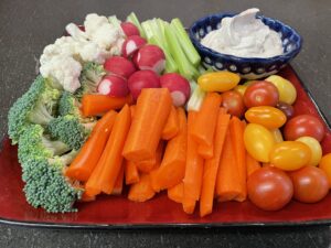Large or small or individual, a charcuterie plate is one of those delightful party platters that can also be an intimate dinner for two (The Husband and me) or one (me.) I once read that in the interest of time, at a party it’s best to limit the types of food on a charcuterie platter to three: three meats, three cheeses, three vegetables/fruits. That prevents people from lingering with indecision.