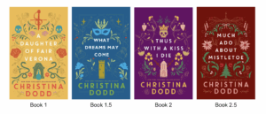 Meet Rosie Montague, Romeo and Juliet’s oldest, the daughter who manages the household while her charming, enamored parents spout love poetry. Since she was thirteen (Juliet’s age when she married,) Rosie has managed to sidestep marriage offers. Now twenty, a spinster and, worse, a virgin, she’s trapped when an evil, influential duke demands to wed her. Trapped…until she finds the serial wife killer stabbed to death in the Montague garden.